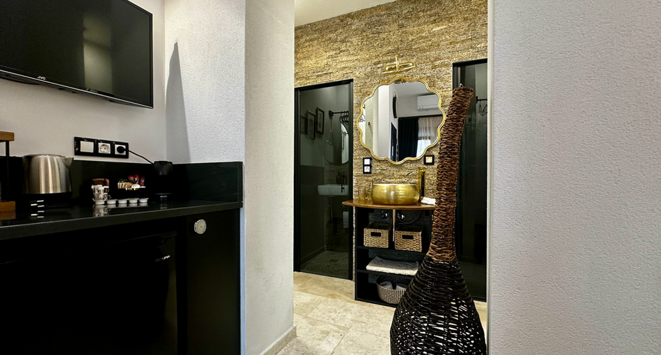 Modern and moody in the best way, the Black Room offers a quiet, stylish retreat for two. With soft lighting and rich textures, it’s perfect for couples seeking a calm, comfortable space in the heart of Limenas.
